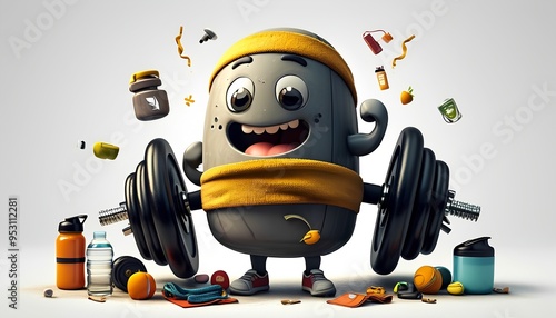 A cartoon character is doing a squat with a dumbble weight and a towel around his neck and a bottle of water