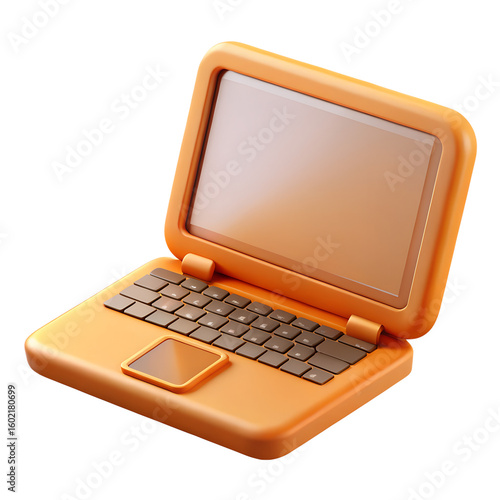 A cartoon orange laptop computer with an open screen and keyboard isolated on transparent background