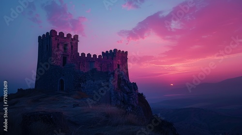 A castle is perched on a hilltop, with a beautiful sunset in the background. The sky is filled with pink and purple hues, creating a serene and peaceful atmosphere