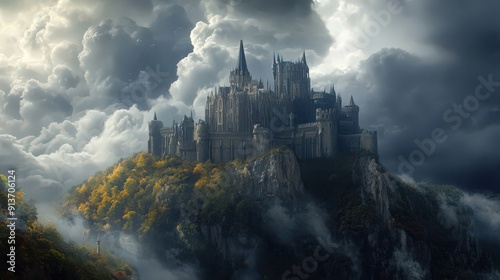 A castle with a backdrop of dramatic storm clouds, highlighting its imposing