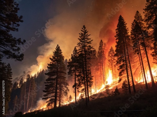 A Catastrophic Night Scene of a Raging Wildfire Devouring a Dense Forest, Illuminated by Fierce Flames and Ominous Smoke, Showcasing Nature's Destructive Power