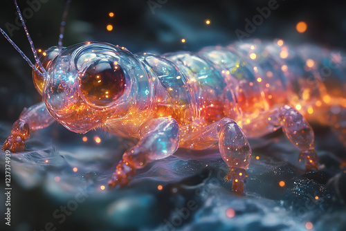 A caterpillar made of translucent, glowing segments, moving through a surreal dreamscape.