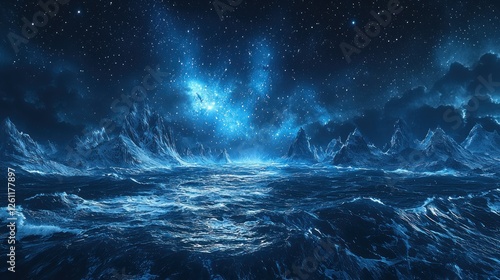 A Celestial Nightscape Over Frozen Mountains and Ocean