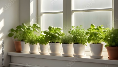 A charming arrangement of fresh herbs flourishing on a sunlit windowsill, creating a vibrant indoor garden.