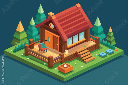 A charming cabin with a porch, chair, and decorative elements nestled among evergreen trees in a peaceful setting