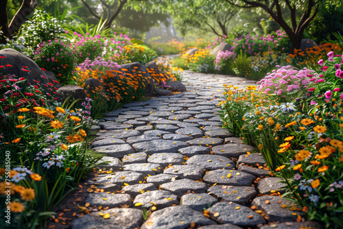 A charming cobblestone path winding through a blooming garden, inviting leisurely strolls and contemplation. Concept of a leisurely garden walk. Generative Ai.