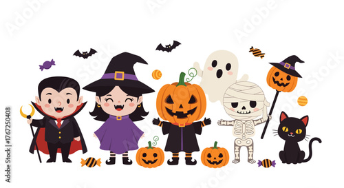 A charming collection of cute and kid-friendly Halloween vector illustrations featuring ghosts, witches, vampires, pumpkins, mummies, skeletons, and black cats. Perfect for party designs, invitations.