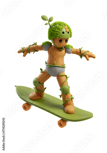 A charming, eco-friendly character, crafted from natural elements, skillfully balances on a unique leaf-shaped skateboard, promoting outdoor fun and sustainability.