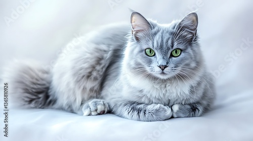 A charming fluffy Chartreux cat with bright green eyes, resting gracefully with its tail encircling its paws, fur highlighted with soft blue-gray, white, and cream tones.