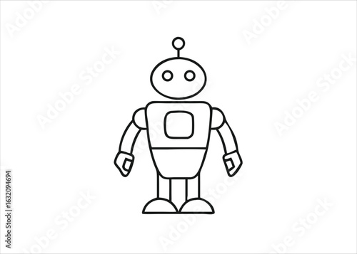 A charming line art depiction of a classic retro robot with a friendly expression presented as a singular graphic element isolated on white background