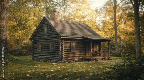 A charming log cabin nestled in a tranquil forest setting with golden autumn leaves scattered on the ground.