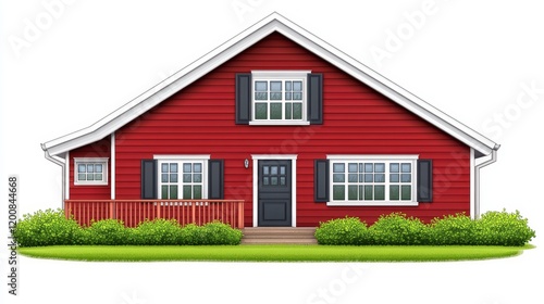 A charming red house with a gabled roof, dark shutters, and small porch