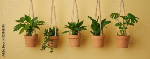 A charming row of houseplants suspended in macrame hangers creates a vibrant indoor garden.