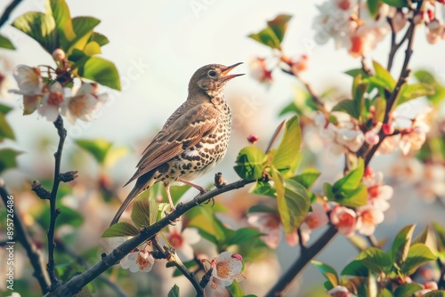 A charming scene of a song thrush singing from the top of a flowering tree.