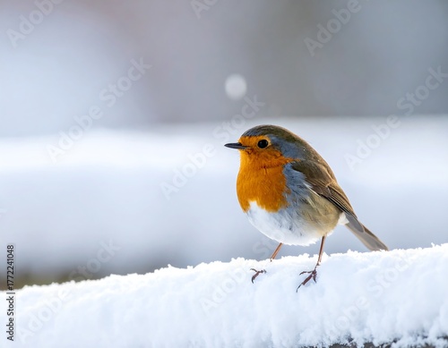 A charming, small avian creature with orange breast, perched on snow-covered railing