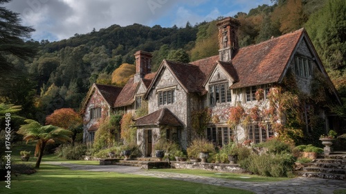 A charming stone manor house with ivy-covered walls sits amid lush gardens and trees, nestled at the edge of a forested hillside