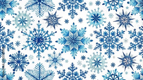 A charming vintage hand-drawn seamless pattern of blue snowflakes, perfect for textiles and wallpaper designs, brings a nostalgic winter ambiance to any space.