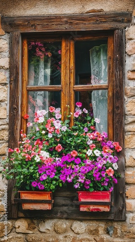 A charming window adorned with vibrant flowers in wooden pots, creating a picturesque and inviting atmosphere.
