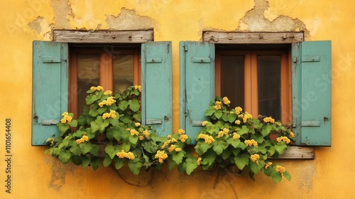 A charming yellow wall with two windows adorned with vibrant flower in green pots.