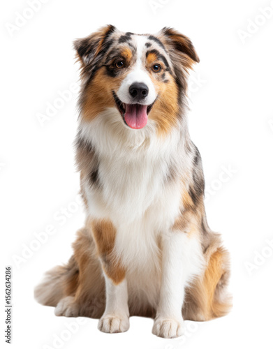 A cheerful Australian Shepherd dog sitting upright on a clean white background. showcasing its playful demeanor and beautiful coat. perfect for pet-related content or advertisements