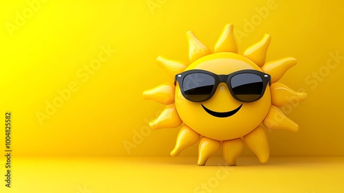 A cheerful cartoon sun wearing sunglasses smiles against a bright yellow background.