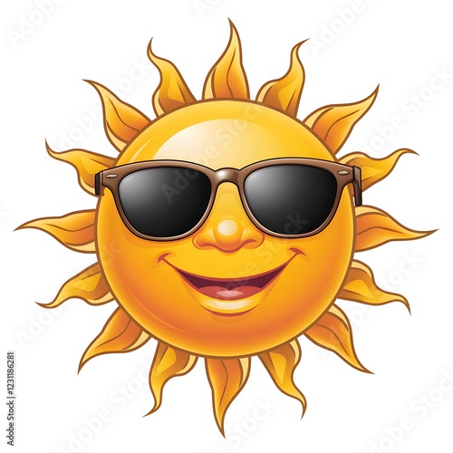 A cheerful cartoon sun with a smiling face, wearing brown sunglasses, and bright yelloworange rays. Its a fun, summery image.