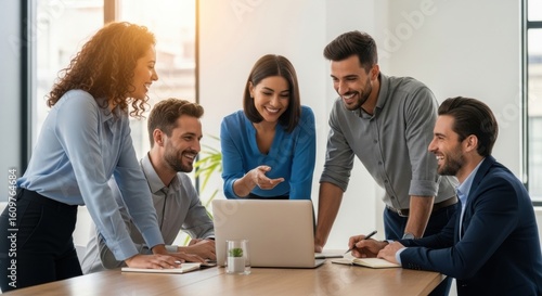 A cheerful diverse team working together on a laptop in a sunlit office. A creative group of colleagues collaborating on a business project.