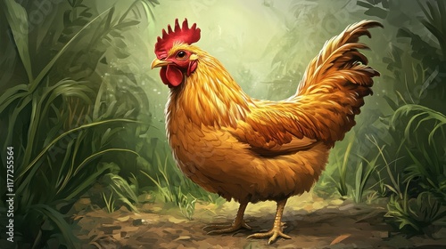 A cheerful fat chicken pecking the ground in a vibrant.