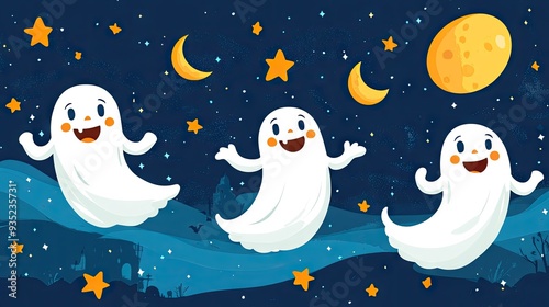 A cheerful Halloween background with smiling ghosts, stars, and moons, leaving space for copy.