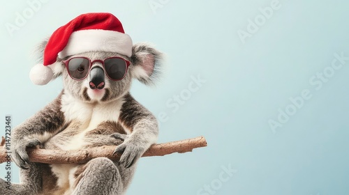 A cheerful koala wears a red Santa hat and sunglasses christmas with a light sky background