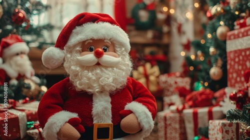 A cheerful Santa Claus doll sits beside a beautifully decorated Christmas tree, enhancing the festive atmosphere of the holiday season.