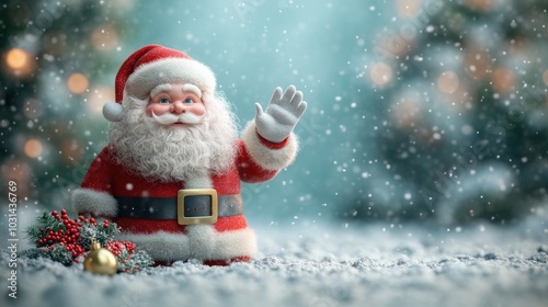 A cheerful Santa Claus figurine waving in a snowy setting.