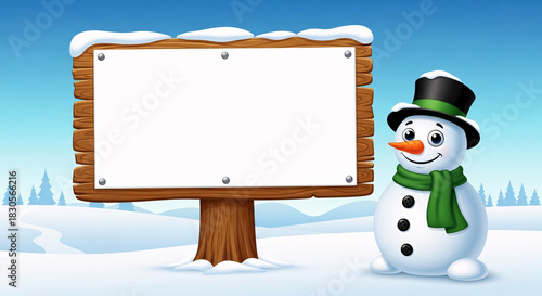 A cheerful snowman stands beside a blank wooden sign, offering versatile copy space for minimalist happy holidays covers, festive Christmas banners, or exciting New Year 2026 announcements.