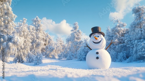 A cheerful snowman stands in a snowy forest under a clear blue sky.