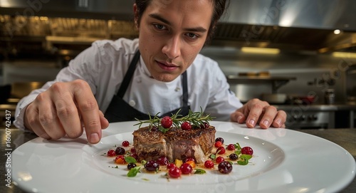 A chef carefully plating a steak dish with berries and rosemary in a professional kitchen setting nicely