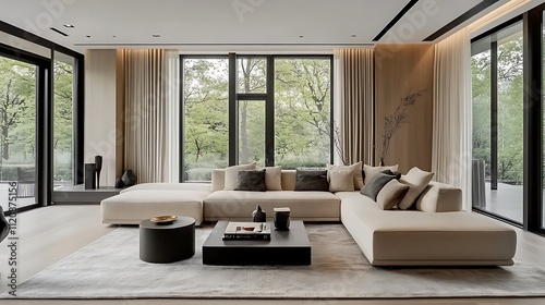 A chic minimalist living room with a light-gray sectional sofa, wooden floors, and oversized windows showcasing a lush forest view.