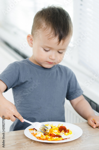 a child in a t-shirt in the kitchen eating an omelet, a fork