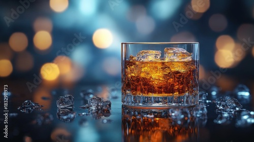 A chilled glass of whiskey with ice cubes reflects in a shimmering bokeh background. The scene evokes a sense of luxury and relaxation.