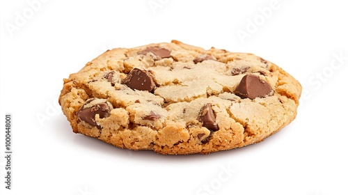 A chocolate chip cookie on solid white background, single object