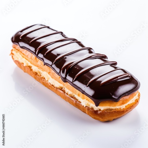 A chocolate covered eclair on a white surface. Photorealistic, on white background