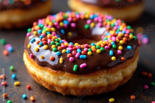A chocolate donut with a generous helping of rainbow-colored sprinkles on top, sweet treat, indulgent
