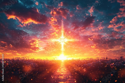 A Christian cross stands upright in a green field as the sun sets in the background
