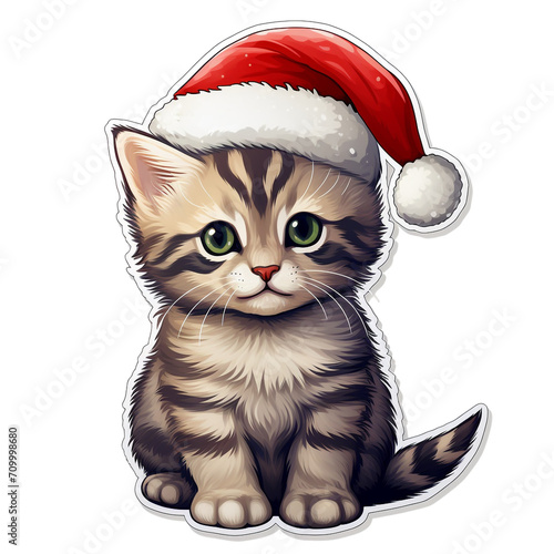 a christmas sticker of a kitten wearing santa claus hat created with Generative Ai