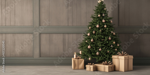 A Christmas tree, adorned with colorful decorations, alongside a gift box beautifully wrapped in a glossy ribbon, laid out in front of wall