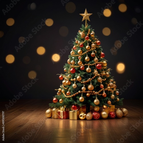 A Christmas tree decorated with golden ornaments and twinkling lights