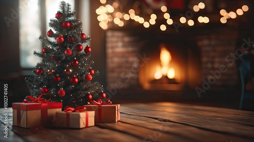A Christmas tree decorated with red ornaments and bokeh lights sits on a wooden table, with gift boxes on the table, a blurred fireplace in the background