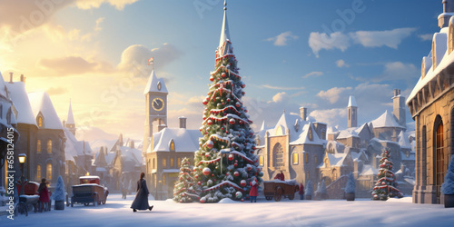a christmas tree is decorated nearby a church in a town