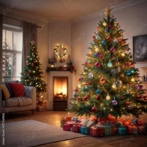 A Christmas tree with multicolored lights and ornaments is placed in a cozy room, holiday decor, multicolor lights