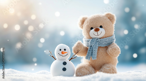 A chubby teddy bear building a snowman,