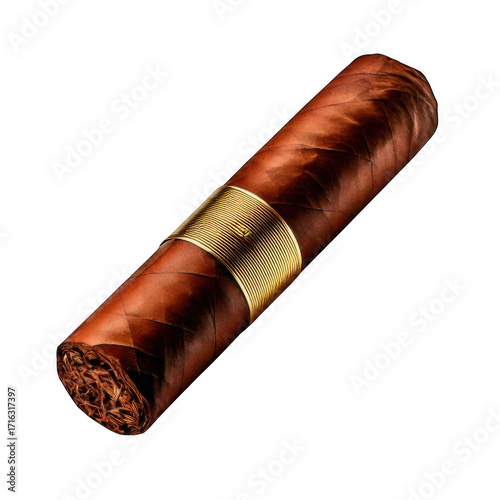 A cigar is shown in its wrapper, with a brown wrapper and a gold stripe